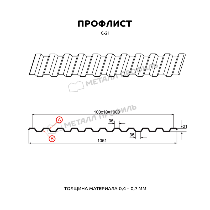 Профлист Металл-Профиль С-21 ECOSTEEL® 0.5 мм Кирпич - это качественный и прочный материал, который идеально подходит для использования в строительстве и отделке зданий.